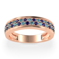 This Swiss Blue Topaz wedding ring is casted in 18K Rose Gold and set with fine quality Swiss Blue Topaz and Blue Sapphire. All of the gemstones we use are of the top 10% available, those found in fine quality boutiques across the world. This Swiss Blue Topaz wedding band can also be added to your collection of minimalist Swiss Blue Topaz rings. This Unique Ring Boasts A Dual Row Of Gemstones, Aligned in The Center And Going Halfway Down The Band. Free shipping, returns, resizing, and a lifetime warranty ensure you love your purchase.