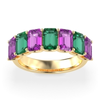 This Amethyst wedding ring is casted in 14k Yellow Gold and set with fine quality Amethyst and Emerald. All of the gemstones we use are of the top 10% available, those found in fine quality boutiques across the world. This Amethyst wedding band can also be added to your collection of minimalist Amethyst rings. A Beautiful Half-eternity Design with Emerald-cut Stones Highlighted By Modern U-prong Settings. Free shipping, returns, resizing, and a lifetime warranty ensure you love your purchase.