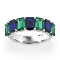 This Emerald wedding ring is casted in Platinum and set with fine quality Emerald and Blue Sapphire. All of the gemstones we use are of the top 10% available, those found in fine quality boutiques across the world. This Emerald wedding band can also be added to your collection of minimalist Emerald rings. A Beautiful Half-eternity Design with Emerald-cut Stones Highlighted By Modern U-prong Settings. Free shipping, returns, resizing, and a lifetime warranty ensure you love your purchase.