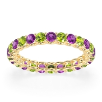 This Amethyst wedding ring is casted in 14k Yellow Gold and set with fine quality Amethyst and Peridot. All of the gemstones we use are of the top 10% available, those found in fine quality boutiques across the world. This Amethyst wedding band can also be added to your collection of minimalist Amethyst rings. This Eternity Band Showcases Round Stones Elevated By U-prongs. Free shipping, returns, resizing, and a lifetime warranty ensure you love your purchase.