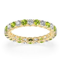 This Diamond wedding ring is casted in 14k Yellow Gold and set with fine quality Diamond and Peridot. All of the gemstones we use are of the top 10% available, those found in fine quality boutiques across the world. This Diamond wedding band can also be added to your collection of minimalist Diamond rings. This Eternity Band Showcases Round Stones Elevated By U-prongs. Free shipping, returns, resizing, and a lifetime warranty ensure you love your purchase.