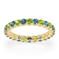 This Peridot wedding ring is casted in 18k Yellow Gold and set with fine quality Peridot and London Blue Topaz. All of the gemstones we use are of the top 10% available, those found in fine quality boutiques across the world. This Peridot wedding band can also be added to your collection of minimalist Peridot rings. This Eternity Band Showcases Round Stones Elevated By U-prongs. Free shipping, returns, resizing, and a lifetime warranty ensure you love your purchase.