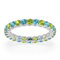 This Peridot wedding ring is casted in Palladium and set with fine quality Peridot and Swiss Blue Topaz. All of the gemstones we use are of the top 10% available, those found in fine quality boutiques across the world. This Peridot wedding band can also be added to your collection of minimalist Peridot rings. This Eternity Band Showcases Round Stones Elevated By U-prongs. Free shipping, returns, resizing, and a lifetime warranty ensure you love your purchase.