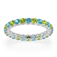 This Swiss Blue Topaz wedding ring is casted in 18k White Gold and set with fine quality Swiss Blue Topaz and Peridot. All of the gemstones we use are of the top 10% available, those found in fine quality boutiques across the world. This Swiss Blue Topaz wedding band can also be added to your collection of minimalist Swiss Blue Topaz rings. This Eternity Band Showcases Round Stones Elevated By U-prongs. Free shipping, returns, resizing, and a lifetime warranty ensure you love your purchase.
