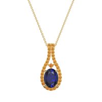 This Blue Sapphire and Citrine Necklace is casted in 14k Yellow Gold. This Women’s Halo necklace features exceptionally fine gemstones, on par with those found in the world's most exclusive boutiques and among the top 10% available globally. Teardrop-shaped Pendant Featuring A Prominent Oval Center Stone Surrounded By A Halo Of Smaller Round Stones. The Elegant Design Is Further Enhanced By Delicate Stone Accents Along The Double Row Bail. This necklace comes with a complimentary 18-inch chain. Enjoy the confidence of our 30-day, stress-free return policy—with return shipping fully covered. Each piece is also accompanied by a Lifetime Warranty, ensuring lasting beauty and peace of mind.