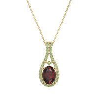 This Garnet and Peridot Necklace is casted in 14k Yellow Gold. This Women’s Halo necklace features exceptionally fine gemstones, on par with those found in the world's most exclusive boutiques and among the top 10% available globally. Teardrop-shaped Pendant Featuring A Prominent Oval Center Stone Surrounded By A Halo Of Smaller Round Stones. The Elegant Design Is Further Enhanced By Delicate Stone Accents Along The Double Row Bail. This necklace comes with a complimentary 18-inch chain. Enjoy the confidence of our 30-day, stress-free return policy—with return shipping fully covered. Each piece is also accompanied by a Lifetime Warranty, ensuring lasting beauty and peace of mind.