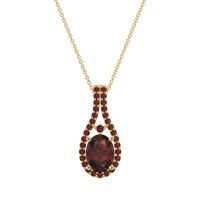 This Lab Ruby and Ruby Necklace is casted in 18k Yellow Gold. This Women’s Halo necklace features exceptionally fine gemstones, on par with those found in the world's most exclusive boutiques and among the top 10% available globally. Teardrop-shaped Pendant Featuring A Prominent Oval Center Stone Surrounded By A Halo Of Smaller Round Stones. The Elegant Design Is Further Enhanced By Delicate Stone Accents Along The Double Row Bail. This necklace comes with a complimentary 18-inch chain. Enjoy the confidence of our 30-day, stress-free return policy—with return shipping fully covered. Each piece is also accompanied by a Lifetime Warranty, ensuring lasting beauty and peace of mind.