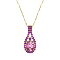 This Pink Tourmaline and Amethyst Necklace is casted in 18k Yellow Gold. This Women’s Halo necklace features exceptionally fine gemstones, on par with those found in the world's most exclusive boutiques and among the top 10% available globally. Teardrop-shaped Pendant Featuring A Prominent Oval Center Stone Surrounded By A Halo Of Smaller Round Stones. The Elegant Design Is Further Enhanced By Delicate Stone Accents Along The Double Row Bail. This necklace comes with a complimentary 18-inch chain. Enjoy the confidence of our 30-day, stress-free return policy—with return shipping fully covered. Each piece is also accompanied by a Lifetime Warranty, ensuring lasting beauty and peace of mind.