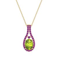 This Peridot and Amethyst Necklace is casted in 14k Yellow Gold. This Women’s Halo necklace features exceptionally fine gemstones, on par with those found in the world's most exclusive boutiques and among the top 10% available globally. Teardrop-shaped Pendant Featuring A Prominent Oval Center Stone Surrounded By A Halo Of Smaller Round Stones. The Elegant Design Is Further Enhanced By Delicate Stone Accents Along The Double Row Bail. This necklace comes with a complimentary 18-inch chain. Enjoy the confidence of our 30-day, stress-free return policy—with return shipping fully covered. Each piece is also accompanied by a Lifetime Warranty, ensuring lasting beauty and peace of mind.