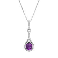 This Amethyst and Lab Diamond Necklace is casted in 18k White Gold. This Women’s Fashion necklace features exceptionally fine gemstones, on par with those found in the world's most exclusive boutiques and among the top 10% available globally. Dazzling Pendant Featuring A Pear-shaped Center Stone Embraced By A Halo Of Smaller Stones. One Additional Round Stone Set Atop Ascends To The Stone Set Bail, Creating A Cascade Of Sparkle. This necklace comes with a complimentary 18-inch chain. Enjoy the confidence of our 30-day, stress-free return policy—with return shipping fully covered. Each piece is also accompanied by a Lifetime Warranty, ensuring lasting beauty and peace of mind.